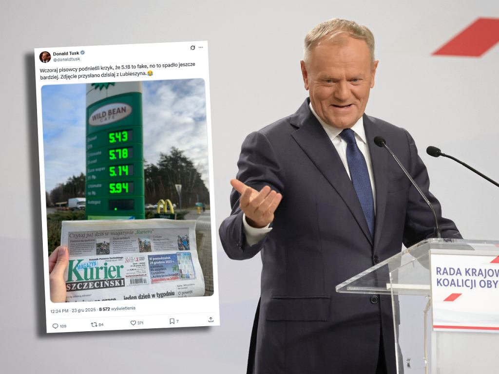 Donald Tusk: „5,18 zł/l to fake? Spadło jeszcze bardziej”
